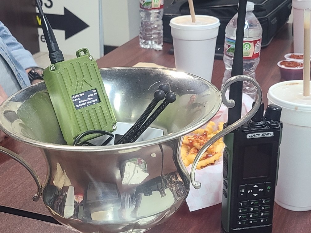 Both Mike KI5YX and Phillip KI5PFV brought their new Baofeng DMR HTs, the new DM32 model with lots of memories and larger size. In the Amateurish (see what I did there?) pic below, Mike’s 55 dollar black and green HT is on the right. Phillip spent $67 to get the clear plastic see through model (and some extra antennas and stuff).