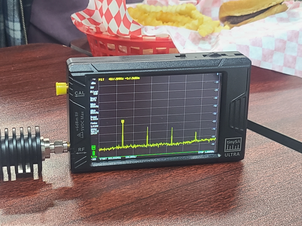 We were going to compare RX sensitivity on Chinese H/Ts, but instead, we spent most of the hour measuring TX output and using a Spectrum Analyzer (Tiny SA on Ebay for $68) to check for spurious output. Shown above is an anomaly, second, third, and fourth harmonics that weren’t there.